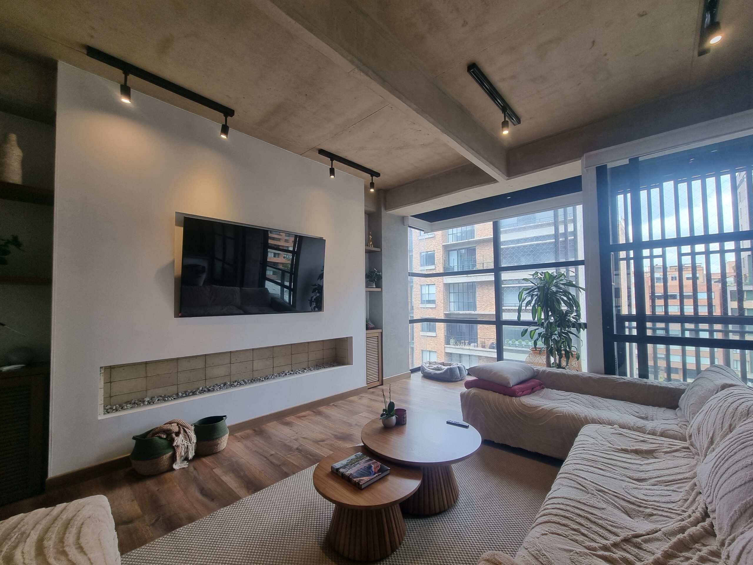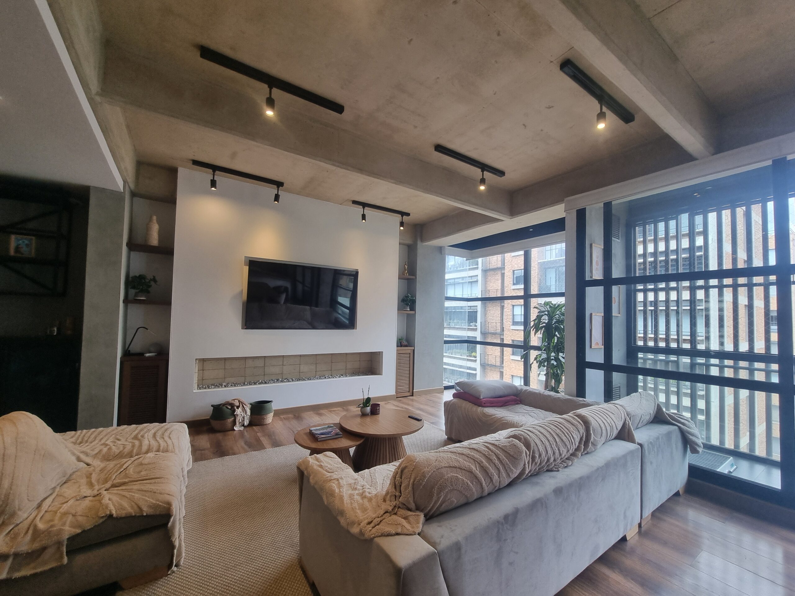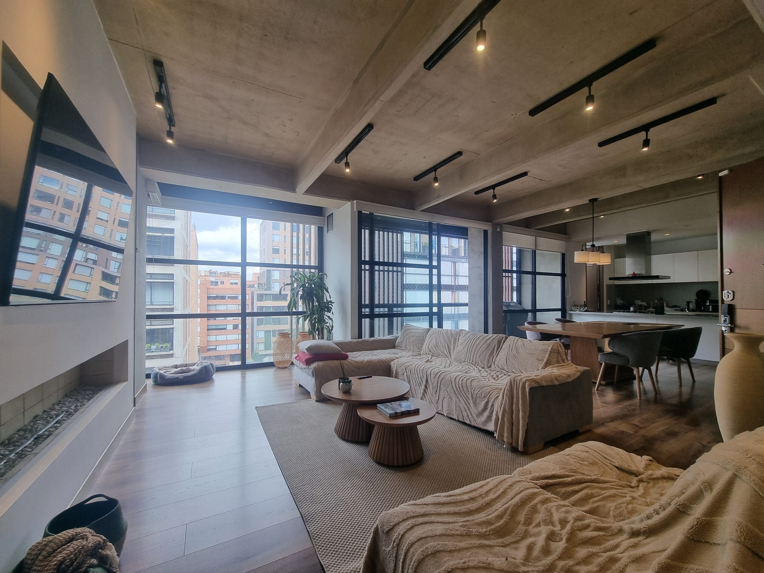 La zona social cuenta con acabados tipo loft, excelente iluminación natural y salida a balcón con vista exterior hacia el occidente. El apartamento ofrece habitaciones amplias con baño privado, elegantes acabados modernos, sonido integrado, y agua caliente mediante caldera comunal.